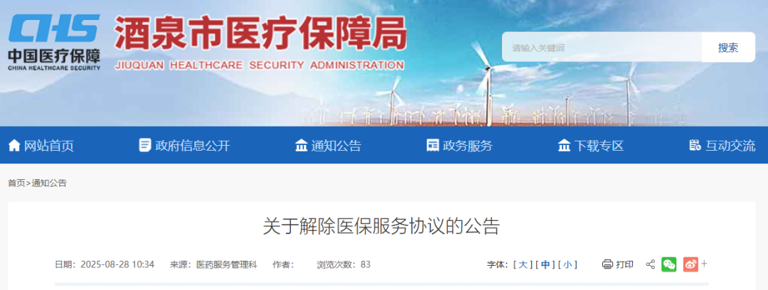 8月28日,甘肃省酒泉市解除李永德诊所等52家定点医药机构医保服务协议。
