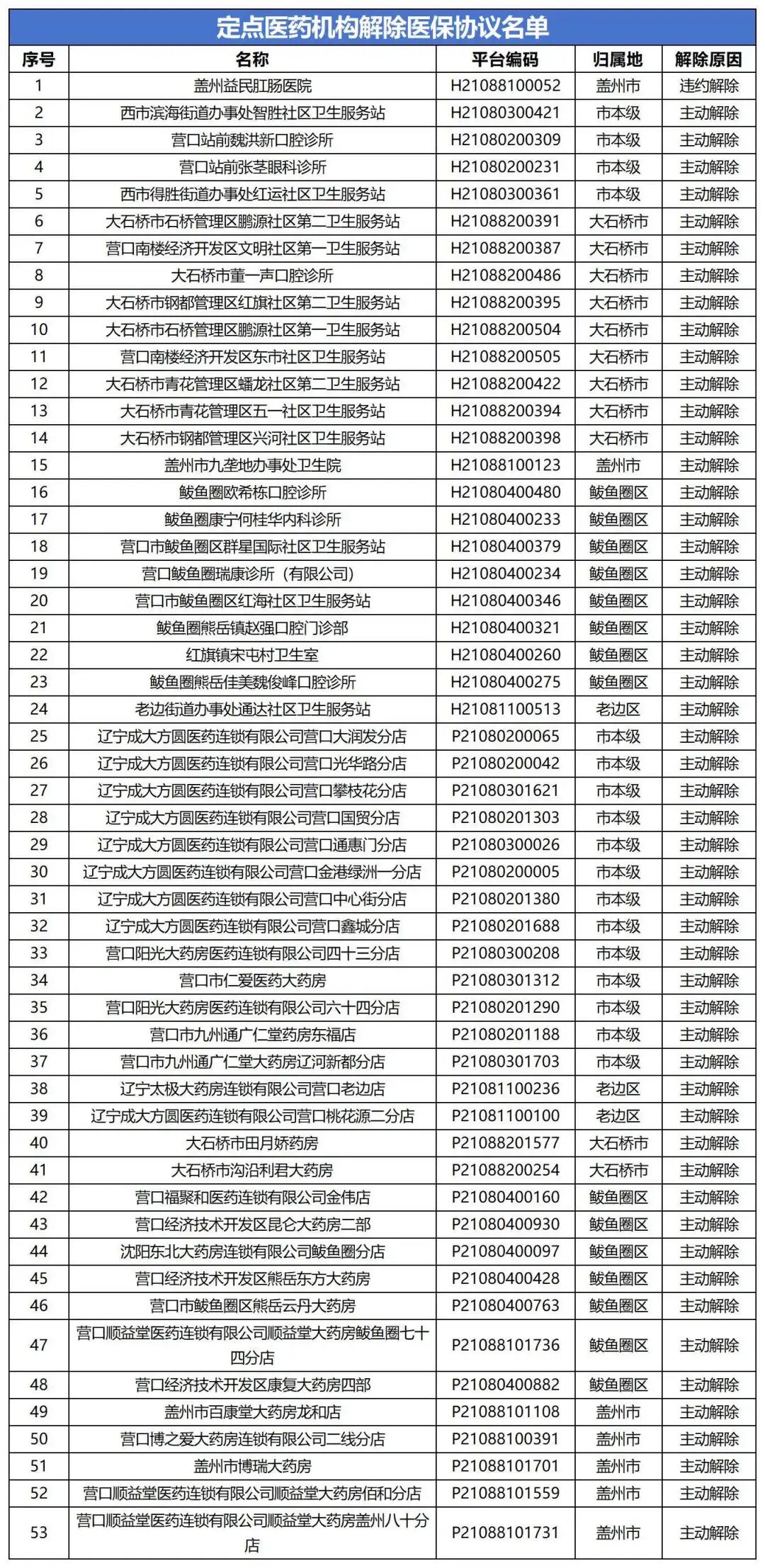 8月28日,辽宁省营口市医保局发布一则《关于定点医药机构解除医保服务协议关系的通知》。公布解除盖州益民肛肠医院等53家医药机构解除医保服务协议。